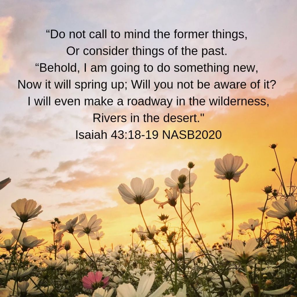 I think God is saying that we need to “spring-clean” our hearts and minds of the old things so that we can be aware of the new things he is going to be doing in our lives. God is all about moving on and forgiveness. Jesus died on the cross once so that His blood redeemed us; past, present and future, from the pit of hell. “It is finished” (John 19:30)